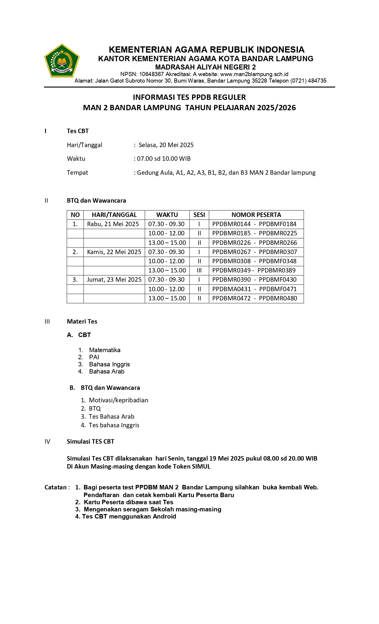 INFORMASI TES PPDB REGULER MAN 2 BANDAR LAMPUNG TAHUN PELAJARAN 2025/2026
